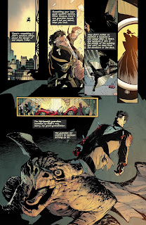 The court of Owls employs a "Talon," a highly-trained assassin with a convoluted method of reanimation from death. When Dick Grayson's DNA shows up on one of the Talon's targets, Nightwing tells Batman his alibi...